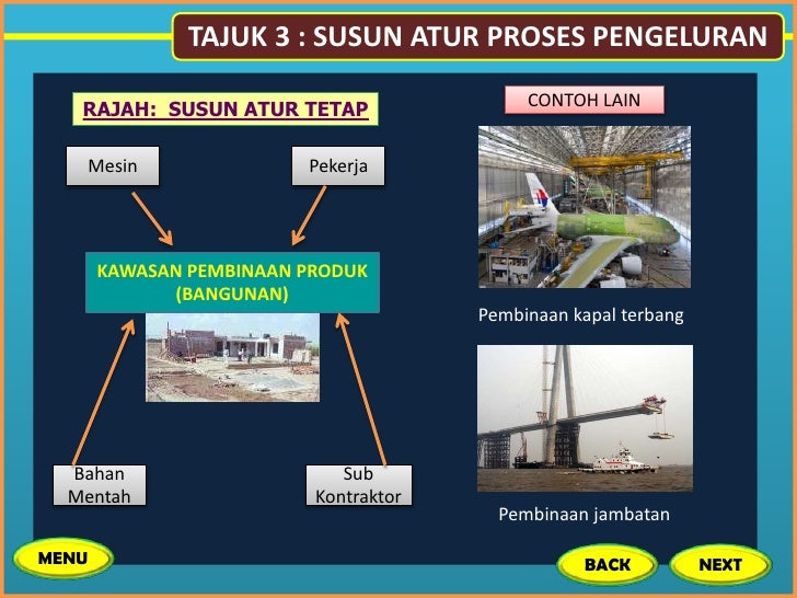3 susun atur produk semua input pengeluaran seperti bahan mentah mesin tenaga kerja dan peralatan disusun khusus mengikut urutan penghasilan sesuatu produk 4 susun atur selular 2 susun atur secara proses contoh organisasi yang menggunakan susun atur secara proses merupakan